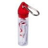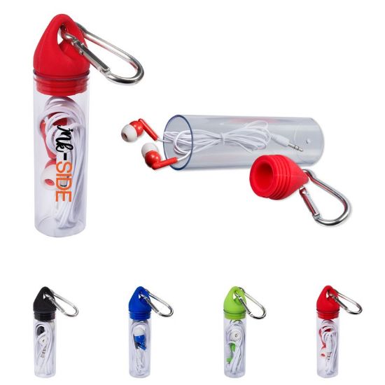 - Earbuds in clear carry case with Iron carabiner attached to Silicone lid for easy carry.